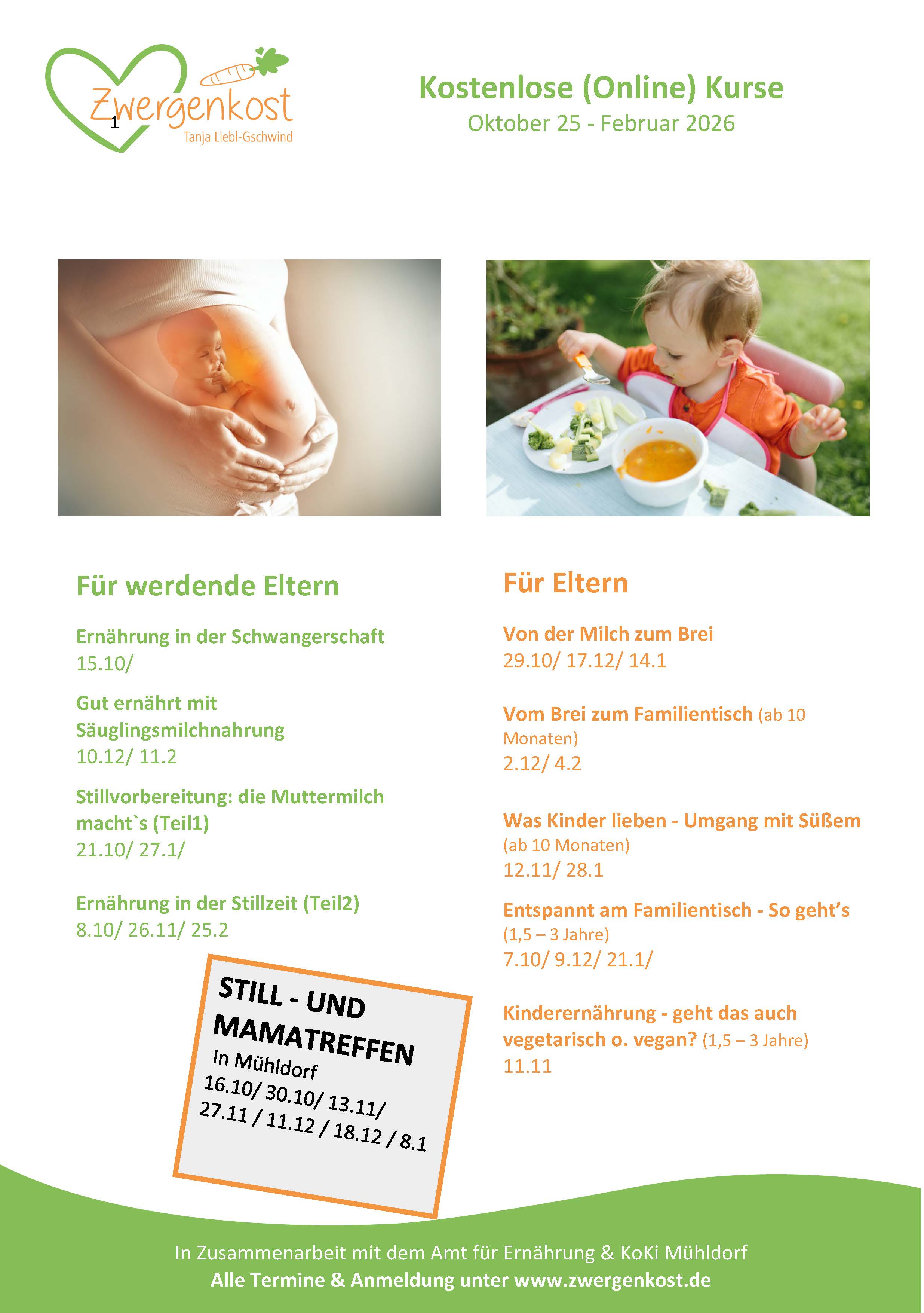 Unsere Onlinekurse zu den Themen Ernährungsberatung, Beikost, Stillen – ganz unkompliziert von zu Hause aus. Die Vorträge finden über Webex statt, und die Teilnahme ist für dich kostenfrei.